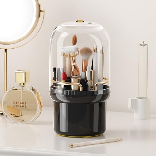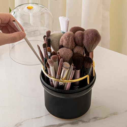 YCIA&DONE - YCIA&DONE Makeup Brush Holder Organizer with Lid, Dustproof Make Up Brushes Organizer Countertop, 360 Rotating Brush Holder for Vanity Dresser - Elegent Black