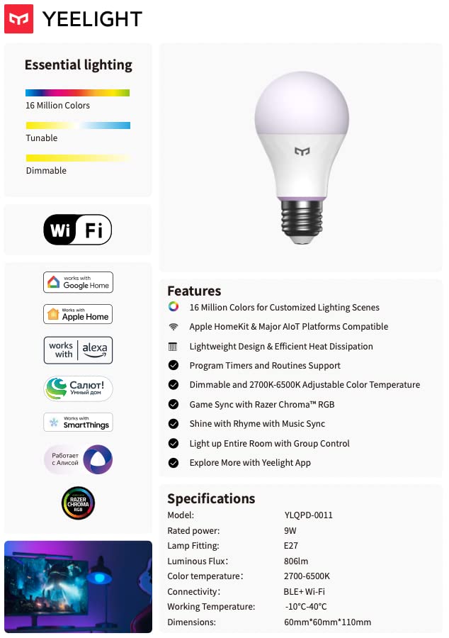 - لون قابل للتخصيص: بالإضافة إلى الضوء الأبيض الساطع، يمكن للمصباح إنتاج درجات مختلفة من الضوء الأبيض الدافئ من 2700 إلى 6500 كلفن قابل للتعديل عبر التطبيق.