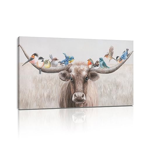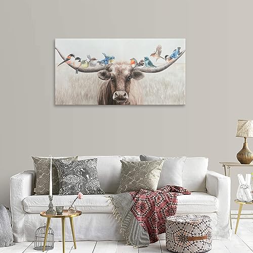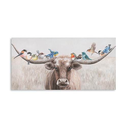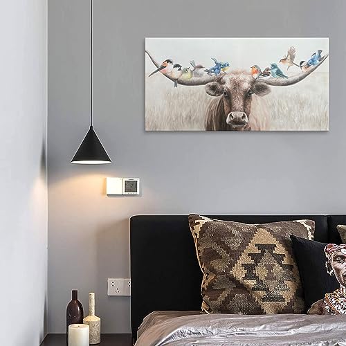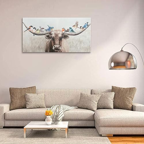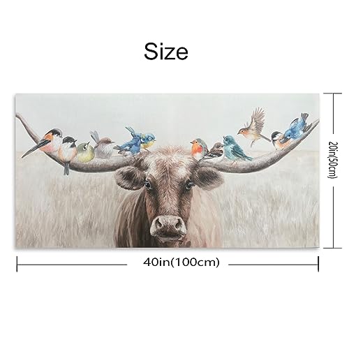 Yelash - يلاش لوحة فنية جدارية كبيرة على شكل قرون طويلة وطيور البقر والايلمر، لوحة قماشية كبيرة بلون بني ورمادي، ديكور غرفة ريفية باطار 20×40 جاهزة للتعليق لغرفة المعيشة والحمام والمكتب