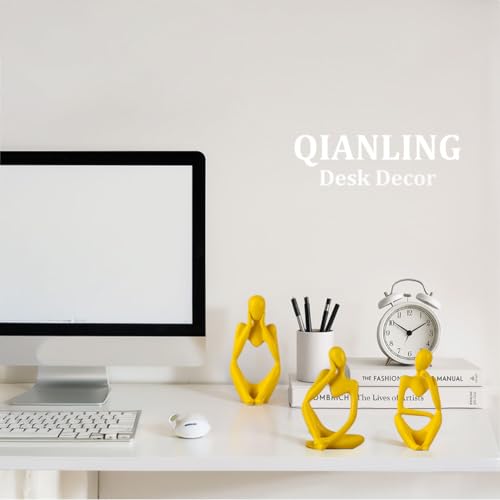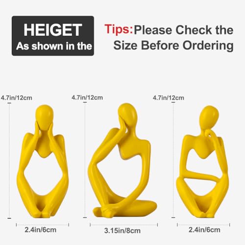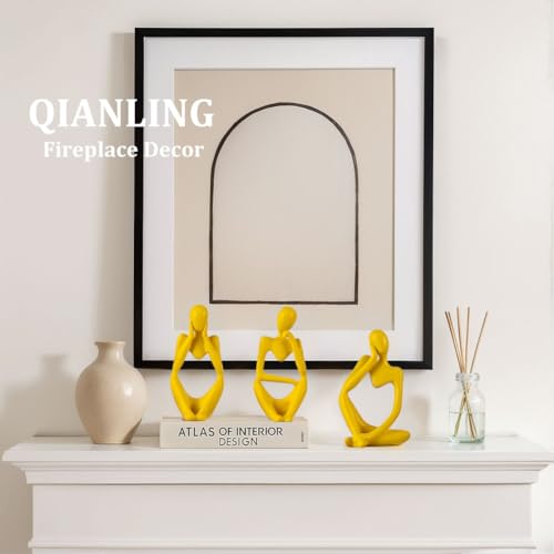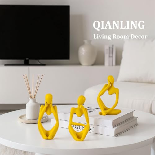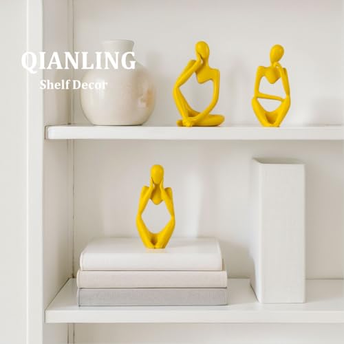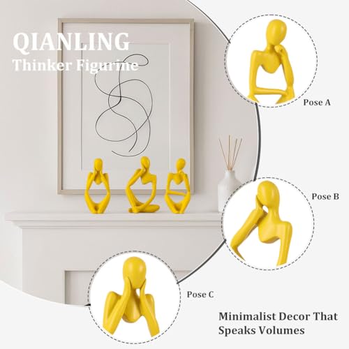 QIANLING - Yellow Thinker Statue Decor for TV Stand, Shelf, Desk, or Coffee Table - Set of 3 Resin Figurines for Living Room Decorative Objects, Modern Sculpture, Minimalist Bookcase Decor, Home Accents