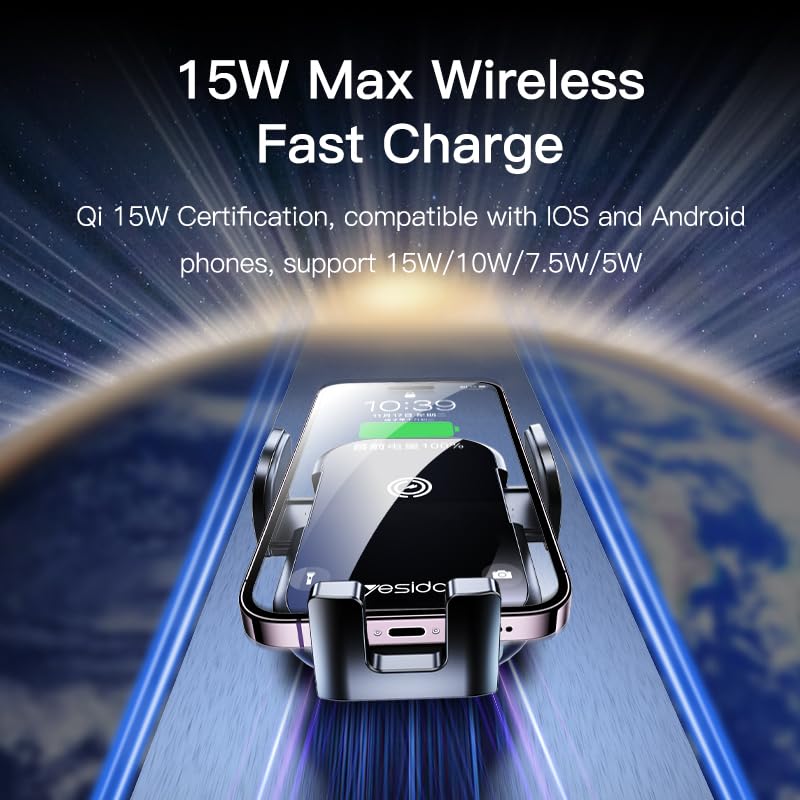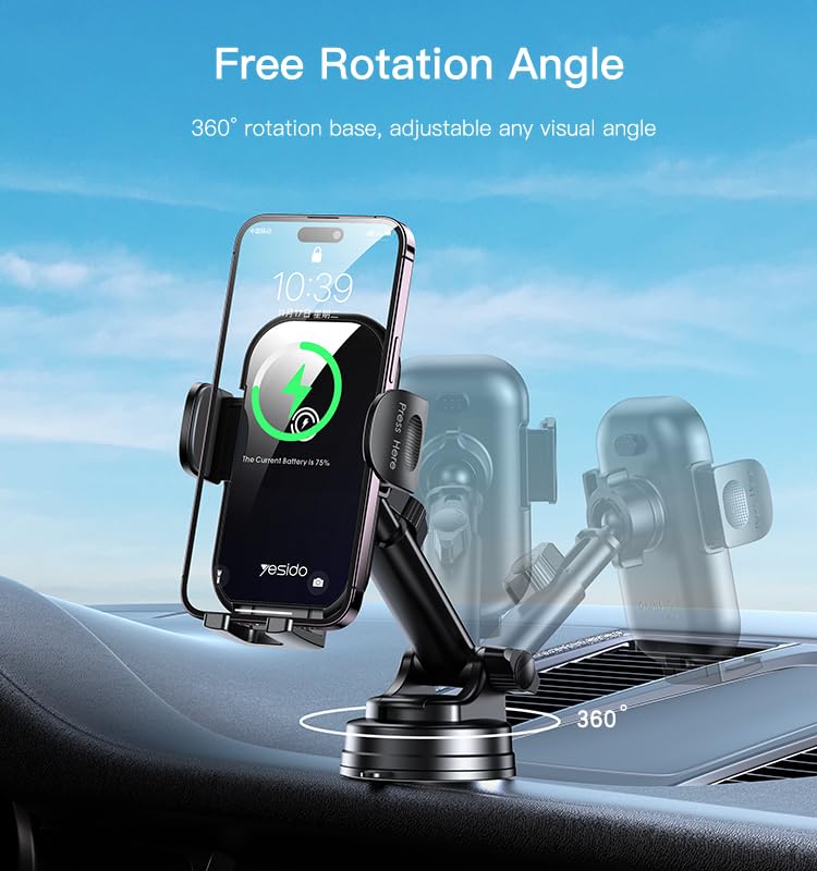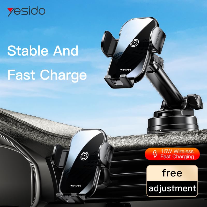 YESIDO - Yesido C197 – Car Mount + Fast Wireless Charging 15W | 360° Rotation | Suction Cup + Vent Clip | Supports Cover Up to 6mm