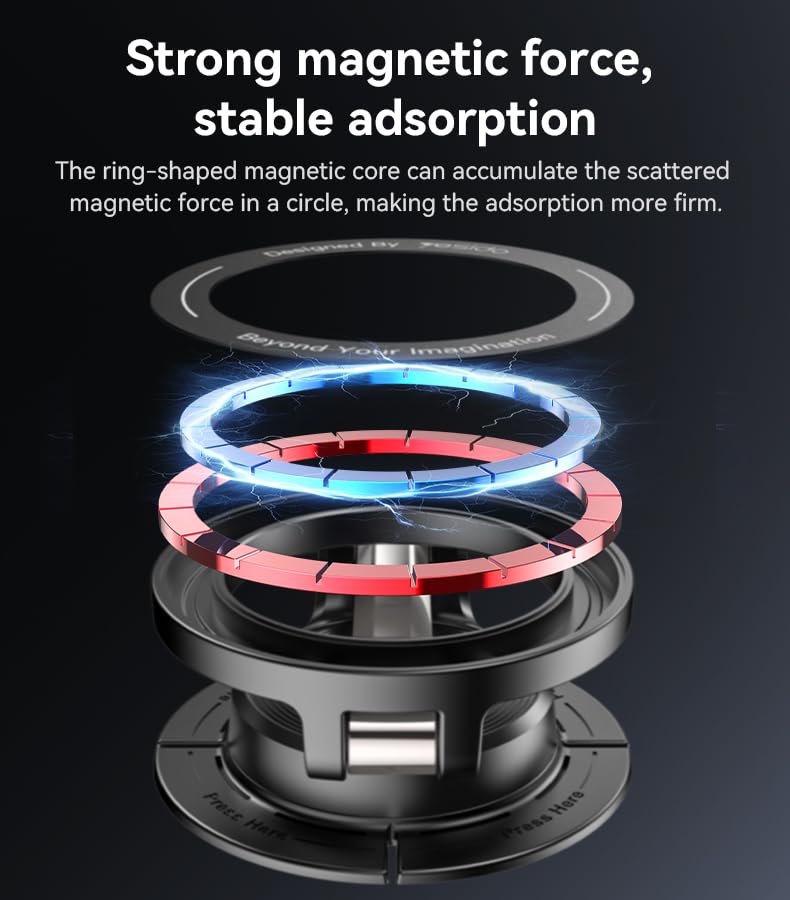 - جاذبية مغناطيسية قوية مزودة بحلقة مغناطيسية دائرية – تضمن قبضة محكمة بتركيبها المغناطيسي المغلق ليظل الموبايل مستقرًا حتى على الطرق غير المستوية.