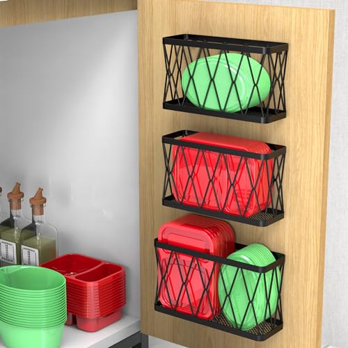 YIGII - منظم دولاب لاصق من 3 قطع ييجي أغطية يثبت على الحائط لباب المؤن صندوق حامل لأغطية علب الطعام للمطبخ وتحت الحوض سلة تنظيم مساحة رفيعة الستانلس ستيل أسود