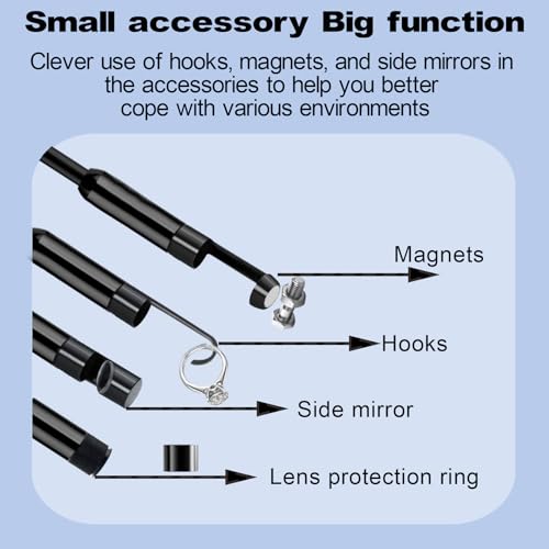 - Wide Application: This industrial endoscope camera is used to inspect hard-to-access areas, and is suitable for many fields such as automobile maintenance, mechanical inspection, pipeline repair, household appliance inspection, house repair, wall structure inspection, sewer/drain pipe inspection, etc. It also comes with 4 useful gadgets: magnet, hook, side mirror and lens protection ring. They can help you in adsorption, hooking, and side viewing respectively