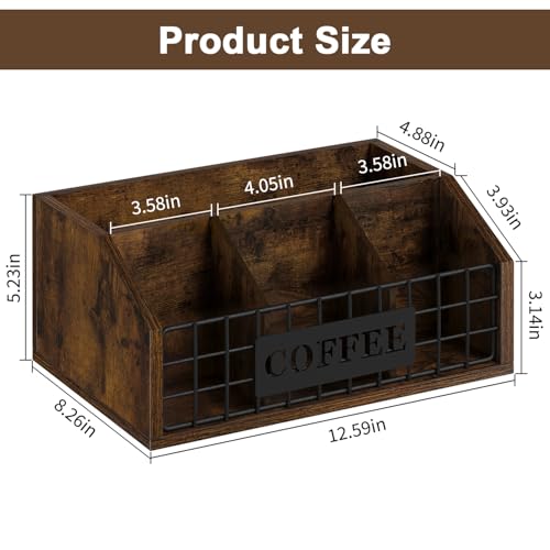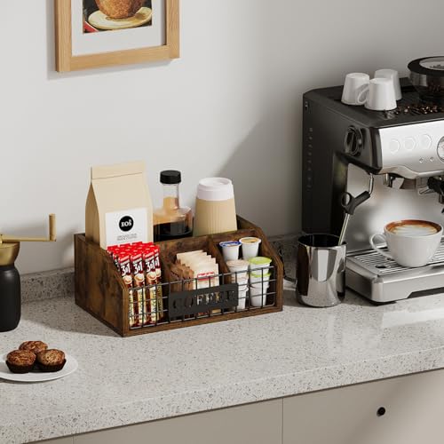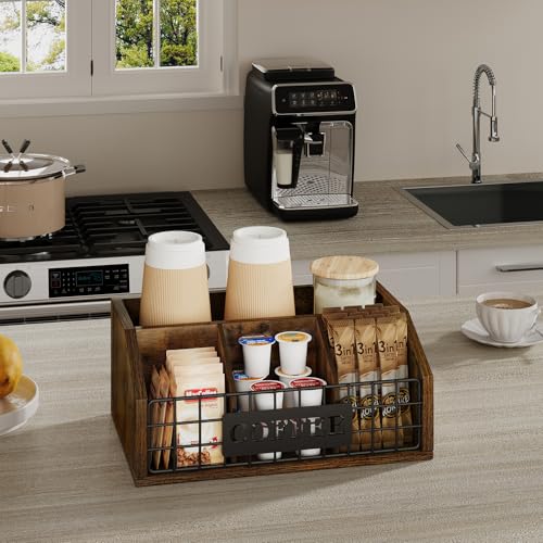 YINMIT - YINMIT Coffee Station Organizer for Countertop, Wood Coffee Bar Organizer with Removable Dividers for Pods, Syrup, Cups, Stirrer, Tea - Office Bar Accessories, Brown (Iron Wire-Vintage Brown, 1 Tier)