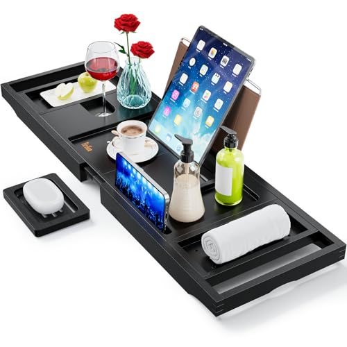 - MULTIFUNCTION BATH TRAY: Bathtub caddy tray for luxury bath is not only a bath table but also a bathroom organizer. And bathtub iPad holder have 3 angled slots fit people of different heights and find the desired angle for better viewing experience.
