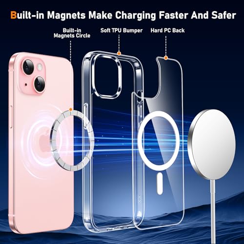 - [Stronger Magnetic Anchor] With perfectly aligned magnets can support all Mag Safe accessories and wireless charging. Super strong magnets enhance adsorption strength ensure your iPhone is automatically connected to a wireless magnetic charger or other magnetic accessories, achieving the fastest and most stable charging possible without signal interference, and preventing your iPhone 15 from falling during use