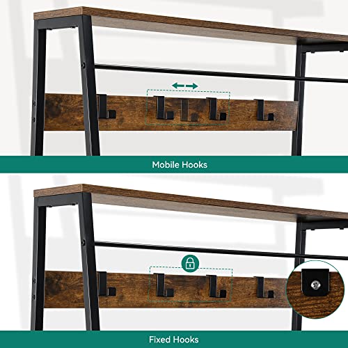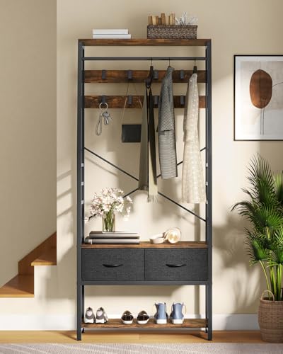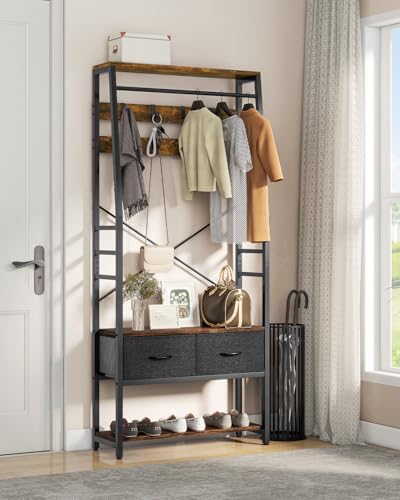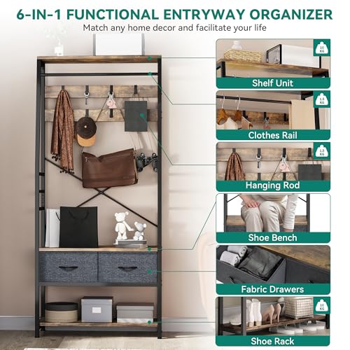 YITAHOME - يتا هوم حامل معاطف مع تخزين الاحذية شجرة قاعة قائمة بذاتها مقعد ودرجين قابلين للطي حوامل معطف صناعية 8 خطافات للممر وغرفة المعيشة النوم اطار معدني بني ريفي
