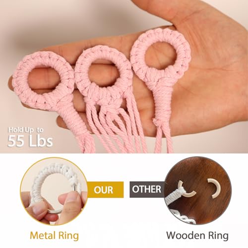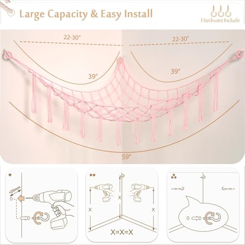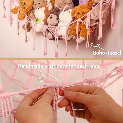 YKBU - شبكة معلقة لألعاب الحيوانات القطيفة المحشوة مع شرابة مكرمية للأطفال من واي كيه بي يو، حامل ألعاب قطيفة بنمط بوهو لديكور غرفة الأطفال (لون وردي فاتح - مقاس L)
