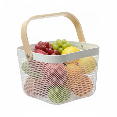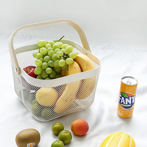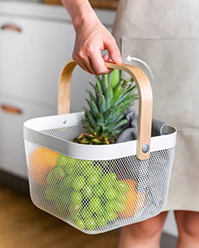 Ymeibe - Mesh Steel Storage Organizer Basket Fruit Basket Bin with Wood Handle Ideal for Kitchen Bathroom Picnic Baskets Pantry Cabinets Storage Home Decor (White)