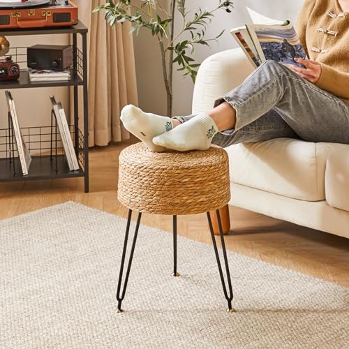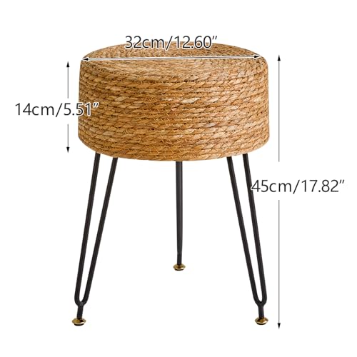 YMYNY - YMYNY Pouf Ottoman, Handmade Natural Water Hyacinth, Pastoral Style Footrest, Footstool with 4 Metal Legs Round Vanity Stool for Bedroom, Hallway, Living Room 12.59"L×12.59"W×17.71"H Natural UHBD029N