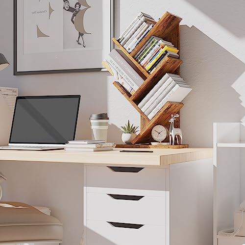 YMYNY - مكتبة شجرة 4 طوابق، دولاب كتب قائمة على الأرض ومنظم تخزين كتب خشبي، مكتبة صغيرة لغرفة النوم والمعيشة والمكتب، رف عرض للأقراص المضغوطة والمجلات والكتب من ياميني، بني ريترو، ارتفاع 60 سم، HBC014H