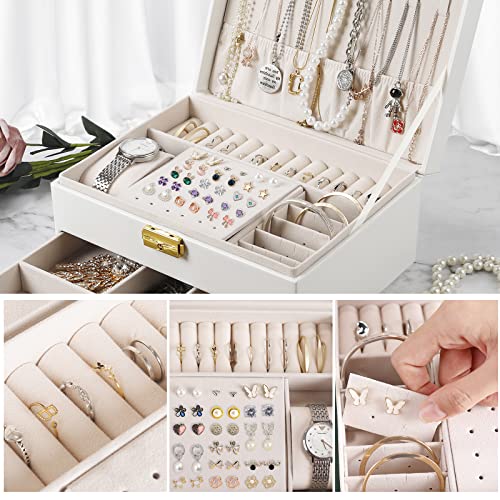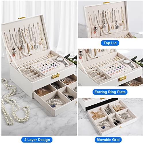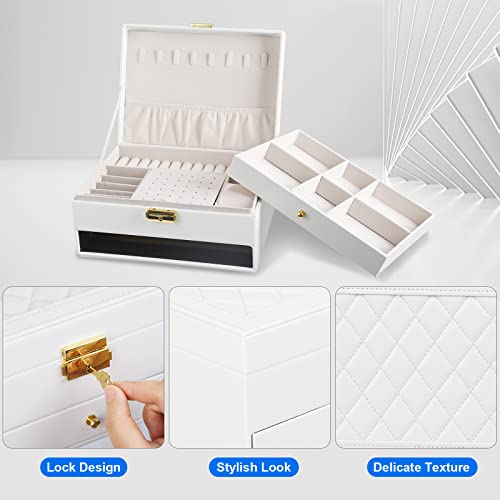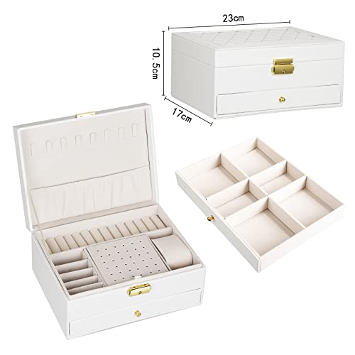 YOCOLE - Jewellery Box, 2 Tier Jewellery Storage Box, Travel PU Leather, Jewellery Organiser for Women and Girls for Rings, Earrings, Necklaces and Watches, with Lock and Key, White