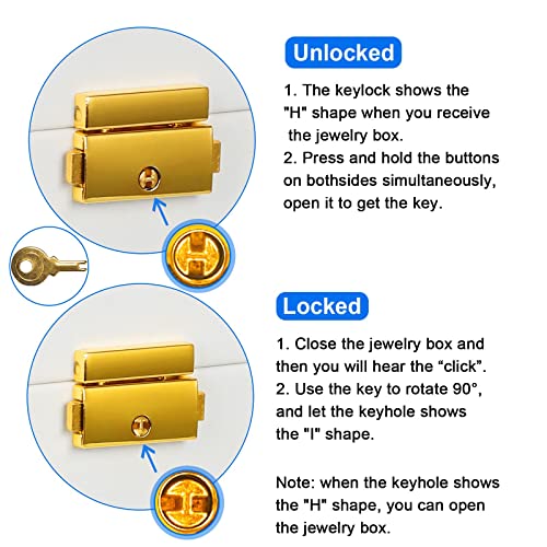 - Privacy lock: the jewellery box is equipped with a robust and durable metal lock and key that is easy to open and close, easy to use and keeps foreign and children away from your valuables. When using for the first time, press the buttons on both sides of the keyhole at the same time to open it.