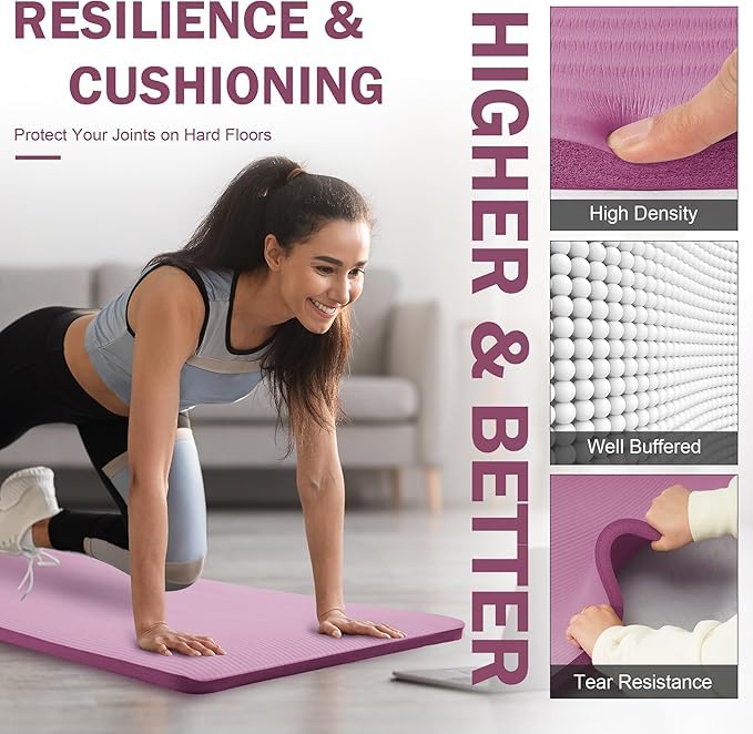 - سجادة يوجا سميكة مع بطانة فاخرة 1 انش: تم تصميمها لتوفير حماية قصوى للمفاصل، تتميز سجادة التمرين الخاصة بنا بسمك 1 انش فائق الدعم لامتصاص الصدمات أثناء اليوغا أو البيلاتس أو التدريبات عالية الكثافة. وسائد الركبتين والمرفقين والعمود الفقري على الأرضيات الصلبة، بينما يناسب مقاس 71 انش طول × 24 انش عرض جميع أنواع الجسم. مثالية للاستوديوهات أو صالات الألعاب الرياضية المنزلية أو تمارين التعافي بعد التمرين