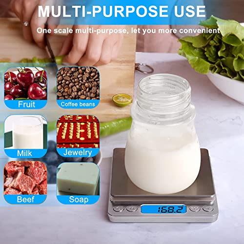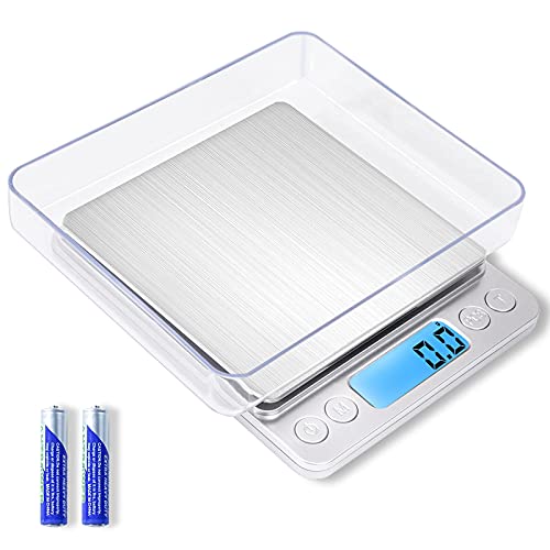 - 【High Accuracy】This digitial food scale features a high precision sensor with 0.1g/0.01OZ accuracy and a weighing range of 0.5g to 3000g, allowing you to weigh more accurately for applications such as weight loss, cooking, baking, jewellery, soap making and many others, allowing you to prepare better meals and have a better life.