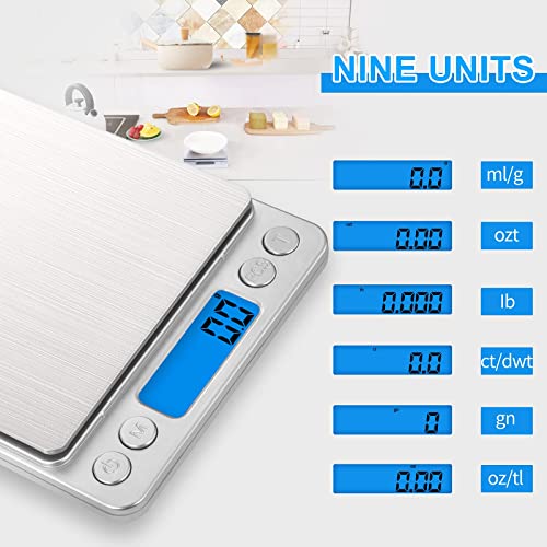 Yoncon - Small Digital Food Scale Ounce/OZ and Gram Scale, Kitchen Scale 3000g/0.1g High Precision for Baking, Soap Making, Jewelry, Includes 2 Trays and Batteries, 9 Units, Tare Function, Easy to Store