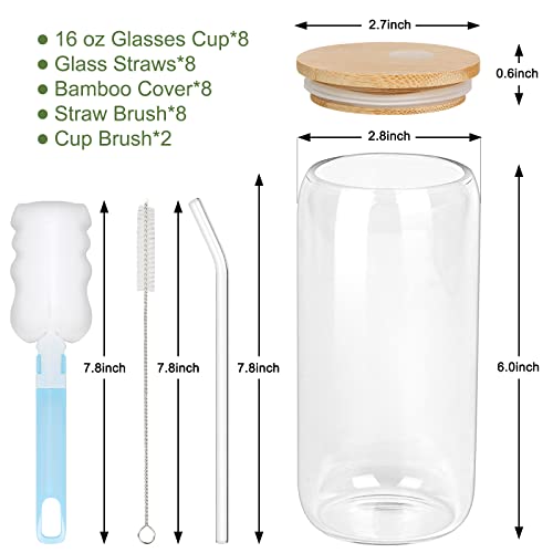 - 【16 OZ BEER CAN GLASSES SET】Glass cup set includes 8 can shaped glass cups, 8 bamboo lids, 8 glass straws,8 straw brush and 2 cleaning brushes. Cear glass cups with lids and straws set is well designed so that wherever you wish to use it they are sure give the best drinking experience possible.