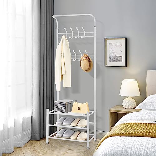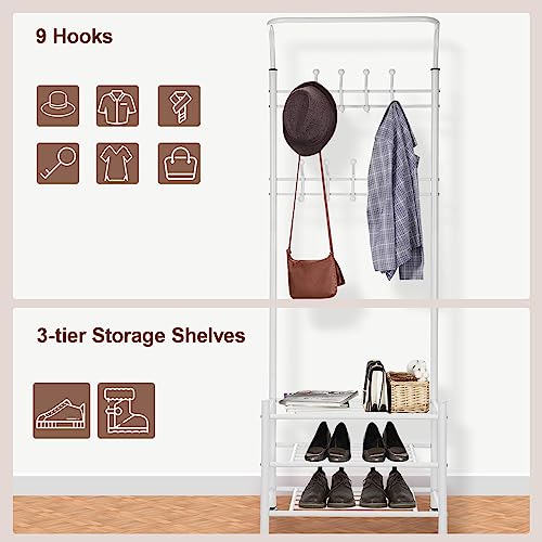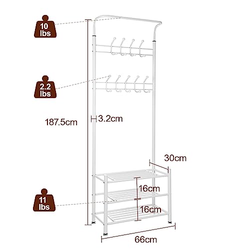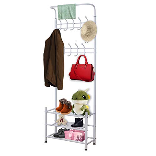 - [3-IN-1 STORGE SYSTEM]:The coat stand is a perfect combo of shelf, coat rack and shoe storage bench for your daily storage needs. The top rod provides space to hang your clothes,Bags, umbrellas, hats, the three-tier shelf below can store 9-10 pairs of shoes,It will store many things in limited space.