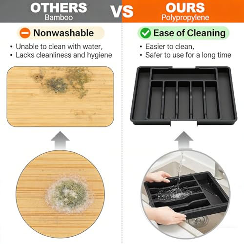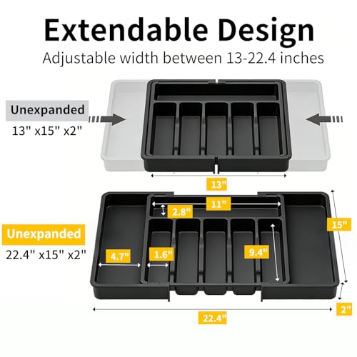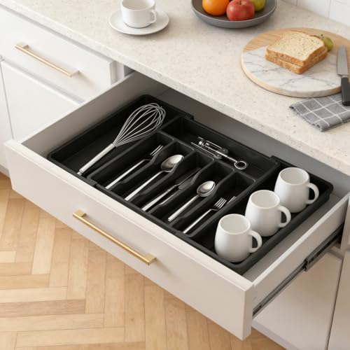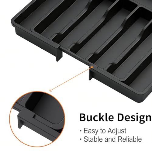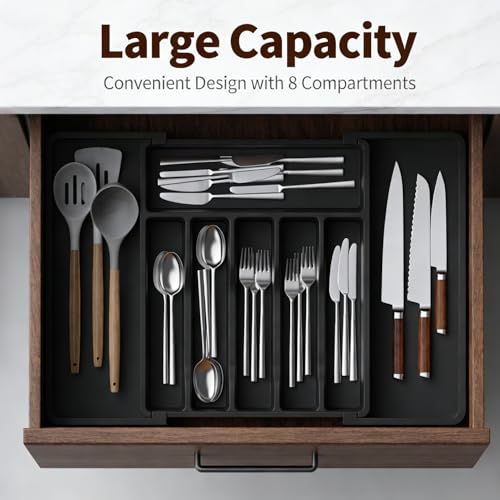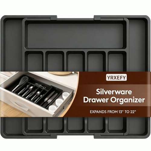 YRXEFY - Large Expandable Silverware Drawer Organizer, Adjustable Utensil Tray for Kitchen, BPA-Free Plastic Storage, Cutlery Holder for Spoons Forks Knives, Black Kitchen Decor