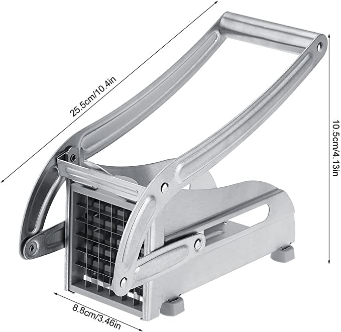 - High-Quality Blade: This product is 10.4x4.13x3.46in, a moderate size that won't take up too much kitchen space. It's lightweight, weighing in at 600g, and the design allows for easy use and storage. The blade is made of high-quality stainless steel, making it strong and durable. You can quickly and easily cut potatoes, carrots, fruit items into 64 pieces of 1/2-inch thick strips, and you don't need to worry about corrosion or rust because they can be washed with water.