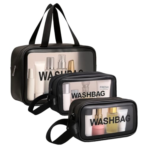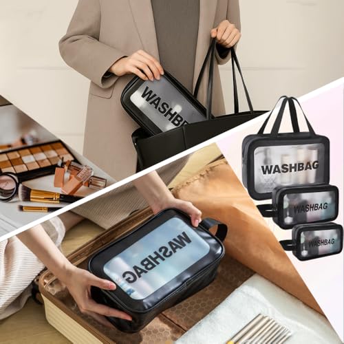 Yuexitech - 3 in 1 Clear Travel Wash Bags, Travel Bag for Toiletries, Pu Waterproof Wash Bag with Zipper Handle, Portable Airport Cosmetic Bags for Bathroom Men Women (Black)