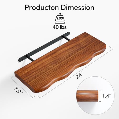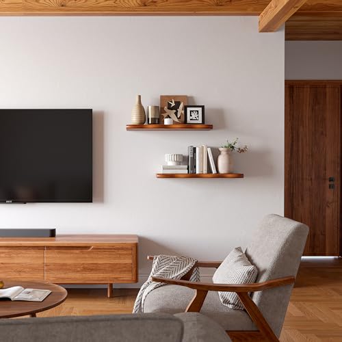 YUFLINX - 24inch Walnut Floating Shelves for Wall,Luxury Rustic Solid Wood Shelf Bracket for Room Decor/Storage/Display,Wall Mounted Hanging Shelves for Bedroom,Living Room, Set of 2