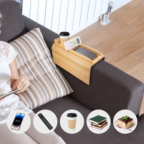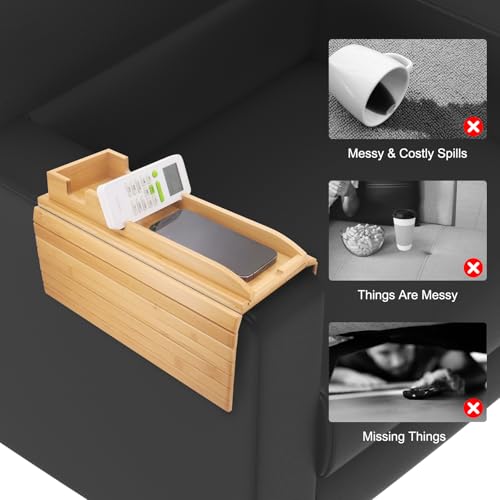 - Anti-Slip Easy-To-Install: The bamboo sofa tray table for couch is easy to install and can be securely secured by simply hanging from the armrest of the sofa without worrying about leaving indentations or dents. The back is equipped with anti-slip pads to ensure stability during use, effectively prevent beverages from spilling out, protect your sofa from pollution, and make your home life more secure