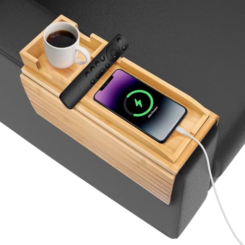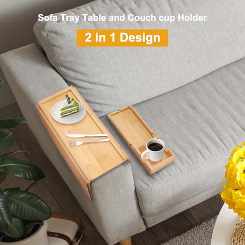 Yuhtech - Sofa Arm Tray, Bamboo Sofa Arm Tray Table, Couch Cup Holder, Foldable Bamboo Pallet with Cup Holder for Snacks, Phones, Remotes