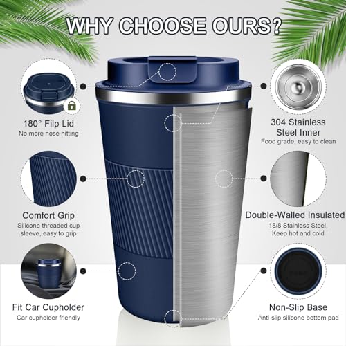 - ✨ 【Easy To Clean & Grip Easily】The large-opening of insulated coffee mug makes easy to clean, the travel coffee mug comes with an eco-friendly flip-top snap and a spiral silicone sleeve for easyily carry out, which makes drinking with one hand comfortable and secure, sealing silicone strip and a screw lid design to prevent spills.