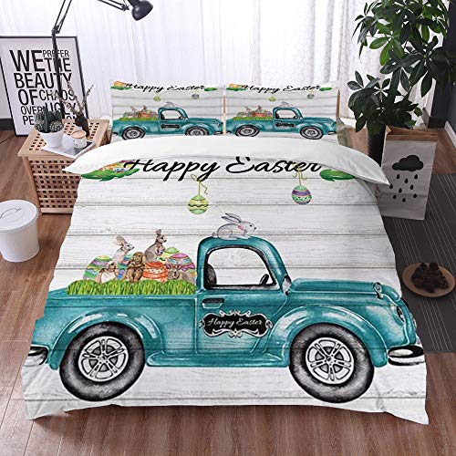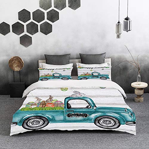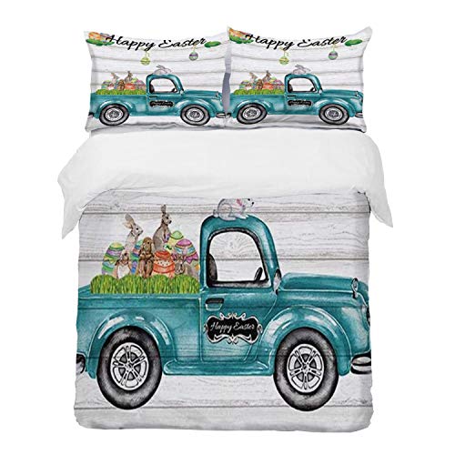 Yuxiang - طقم غطاء لحاف مكون من 3 قطع مقاس 135 × 200 سم + 2 وسادة 50 80 - - - بيض ارنب عيد الفصح مع وسيارة وشاحنة ريترو بوليستر