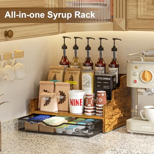 - WIDE RANGE OF USES: In addition to liquor, our wine racks countertop can also store coffee syrups, spice jars, salad dressings, olive oil and other liquor bottles. Our coffee syrup storage creates a warm atmosphere and is the perfect complement to any home decoration.