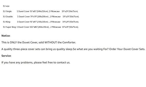 - 【Duvet cover size】Single:(Duvet cover:135X200cm+ 1 pillow Set:50x75CM) Double:(Duvet cover:200X200cm+2 pillow Set:50x75CM) king:(Duvet cover:230X220cm+2 pillow Set:50x75CM) Super King:(Duvet cover:260X220cm+2 pillow Set:(50x75CM)