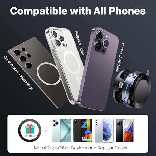 - ✨【Wide Compatibility】The Vmag-S1 Magnetic Phone Holder is designed for iPhones with MagSafe (12 to 16 Pro Max) and Android phones like Samsung, Google, Motorola, and OnePlus. For non-MagSafe phones, just use the included magnetic ring for a strong hold.