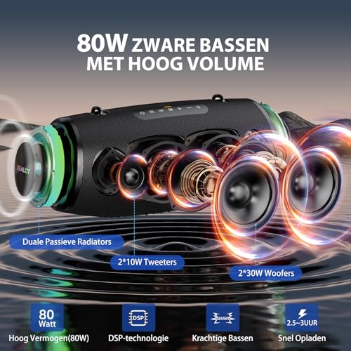 - Captivating sound experience: The ZEALOT Bluetooth speaker unleashes the power of music through a powerful 80W woofer system consisting of two 30W woofers and two 10W tweeters. Enjoy rich and balanced sound in the bass, medium and high frequencies, making it ideal for a variety of music genres.