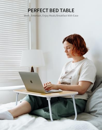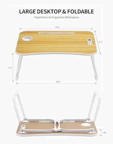 ZEAPTAC - Laptop Bed Desk, Foldable Lap Table, Portable Study Table, Laptop Stand with Cup Holder & Tablet Slot & Lifting Handle for Working Writing Drawing & Eating - Wood