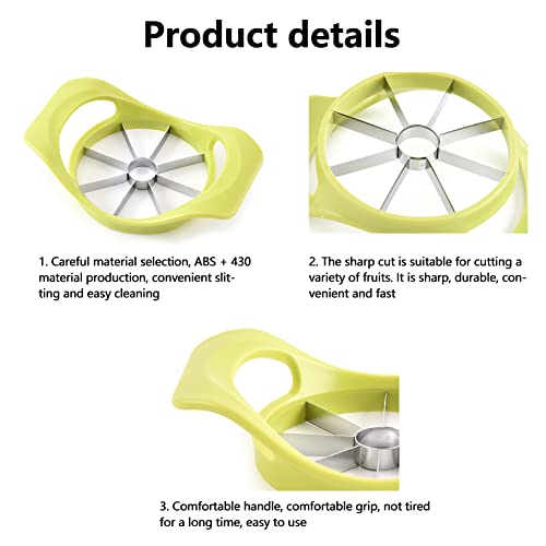 - أداة مطبخ مثالية: يمكنك استخدام قطاعة التفاح لإعداد وجبات خفيفة صحية من التفاح لأطفالك، أو يمكنك بسهولة صنع وجبات التفاح الخفيفة في المكاتب والحفلات. يمكن للقطاعة تقطيع شرائح الفاكهة ذات الحجم المناسب بشكل مثالي ويمكنها أيضًا صنع السلطة وحلويات الفاكهة وأطباق الفاكهة.
