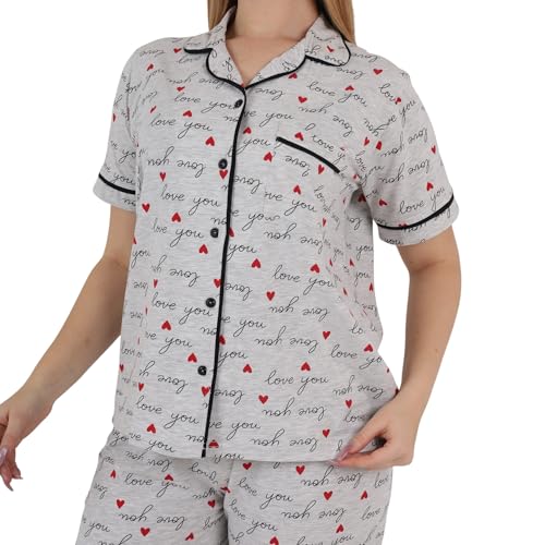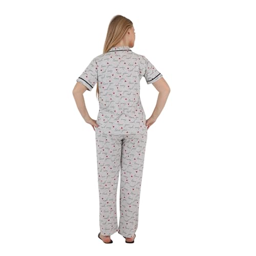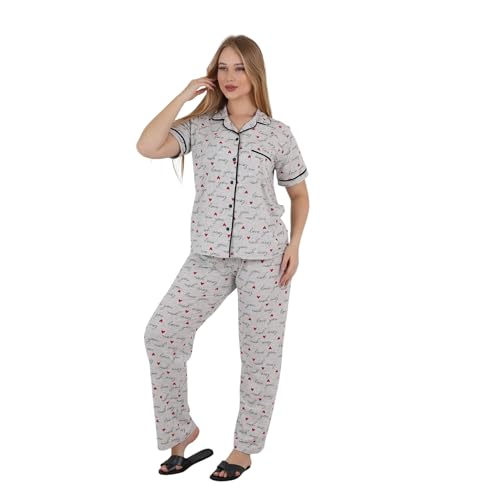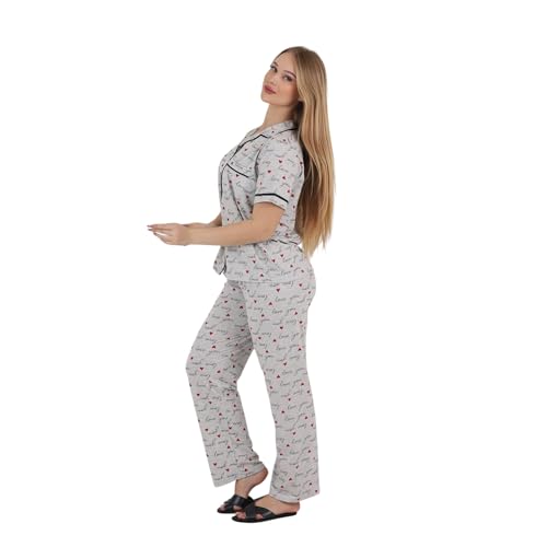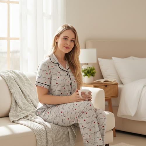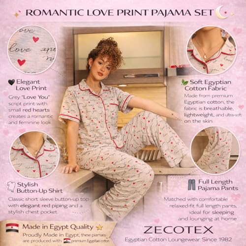 ZECOTEX - ZECOTEX Women's Classic Egyptian Cotton Printed Pajama Set | Grey Love Print Button-Up Loungewear Set | Soft Breathable Sleepwear | Sizes S–3XL | Made in Egypt