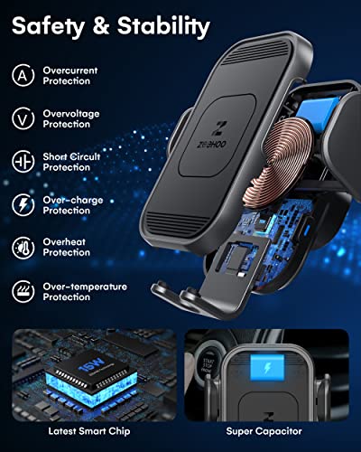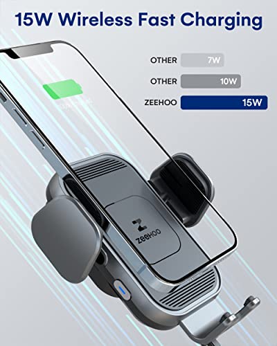 ZEEHOO - زيهو شاحن سيارة لاسلكي، 15 واط كيو اي سريع الشحن مع مشبك تلقائي، حامل موبايل يثبت على التابلوه وفتحة التهوية، حامل موبايل بمستشعر ذكي لشحن تلقائي لايفون 14 13 12 11 برو ماكس، سامسونج جالاكسي S22، نوت