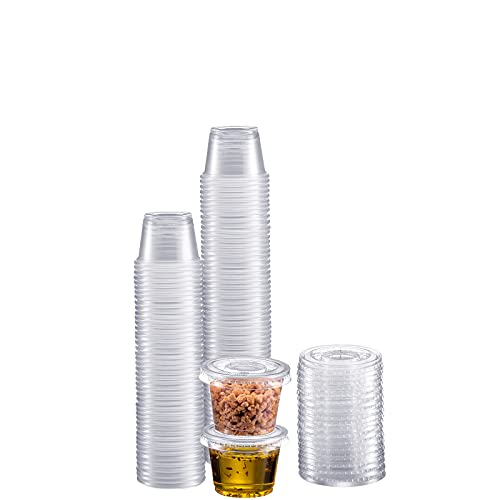 - ⇢ EASY SNAP-ON LEAK-PROOF LIDS – Every 100-pack of 1oz containers comes with an equal number of snap-on lids. These lids provide an airtight seal around the cup, so you never have to worry about leaks and spills.