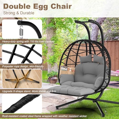 ZENPETIO - كرسي بيضاوي مزدوج مع حامل ومسند للساقين، كرسي متأرجح من البامبو لشخصين مع وسادة مقاومة للأشعة فوق البنفسجية لغرفة النوم والأماكن الداخلية والخارجية والفناء، سلة بسعة 317 كجم من زينبيتيو، لون أسود
