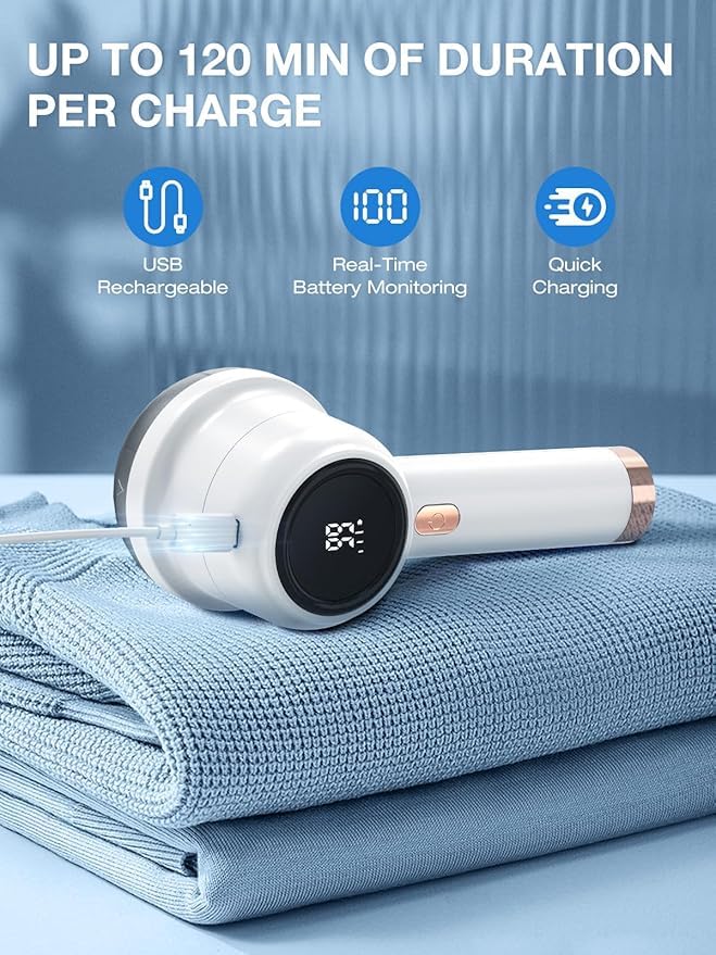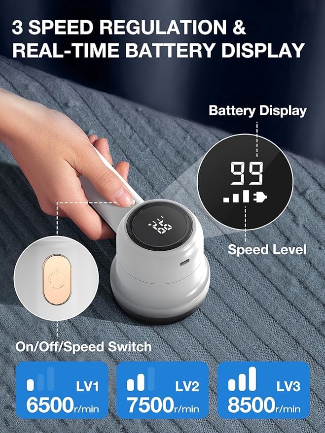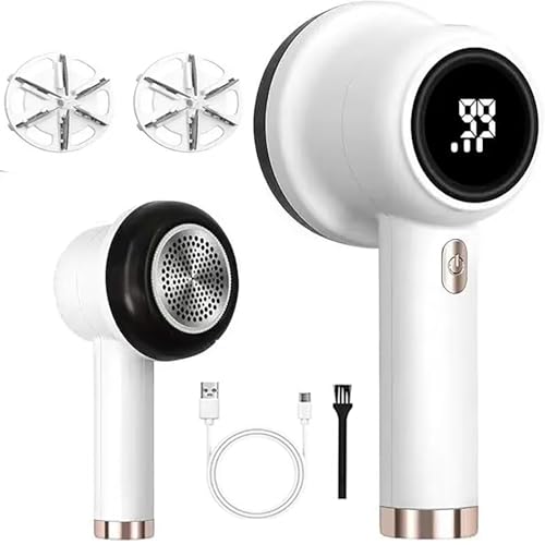 Zenzres - Rechargeable Fabric Shaver, Electric Lint Remover with 3 Speed Settings, LED Display, 6 Blade Design