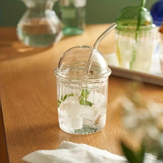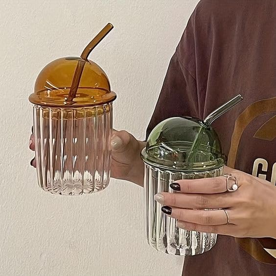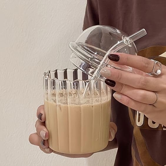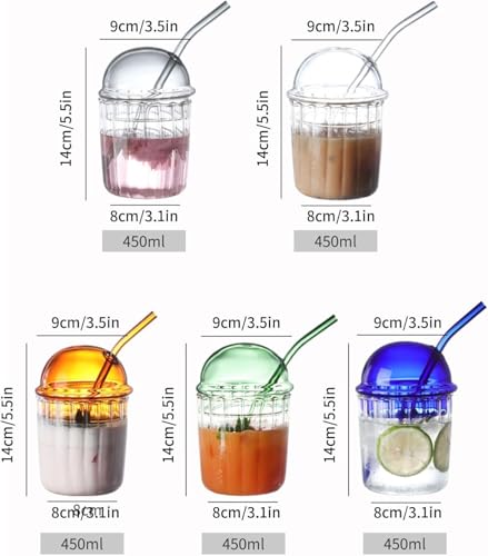 Zephorus - Cute Drinking Glasses with Glass Dome Lid and Straw, Reusable Wide Mouth Smoothie Cups 15oz Glass Coffee Iced Cup Tumbler Glass Bubble Tea Cup for Coke Soda Home Office Bar(White)