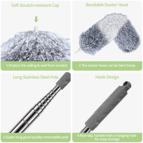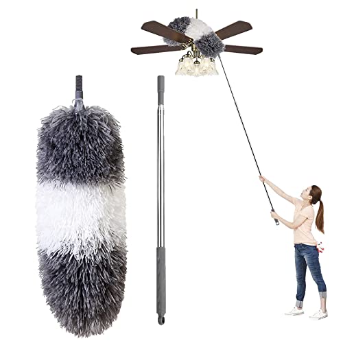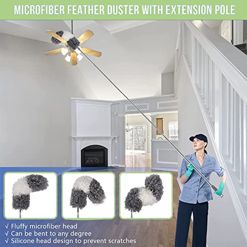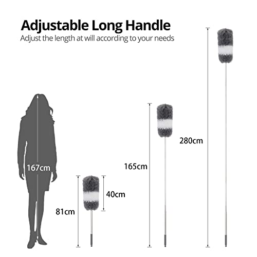 ZERIFAM - زعافة غبار من المايكروفايبر من زيريفام، منفضة ريش بعمود تمديد ستانلس ستيل 280 سم، رأس قابل للانحناء وإعادة الاستخدام، قابلة للتمديد لتنظيف مروحة السقف والأثاث والستائر والسيارة والغبار والعنكبوت