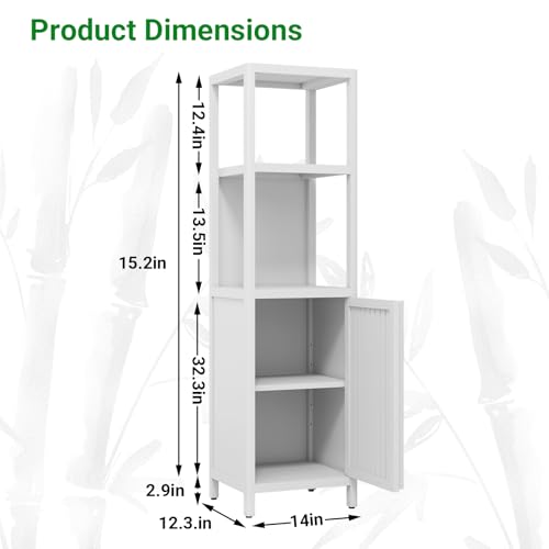 - Space-Saving Cabinet - Maximize your small bathroom space with this compact 14″L x 12.3″W x 52″H cabinet. Its slim and freestanding design helps you utilize narrow corners or tight spaces, keeping essentials organized without taking up valuable floor area.