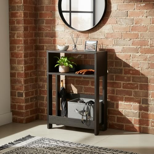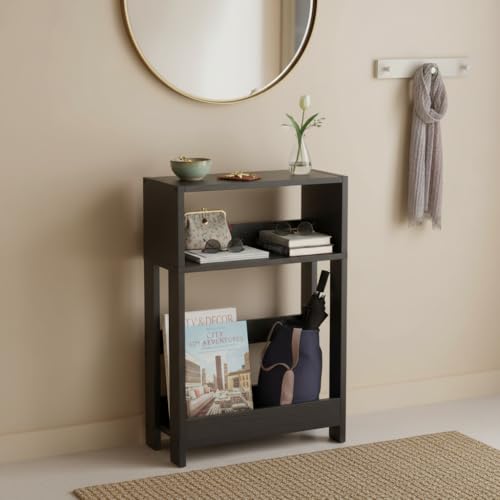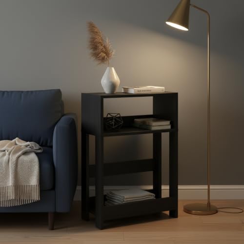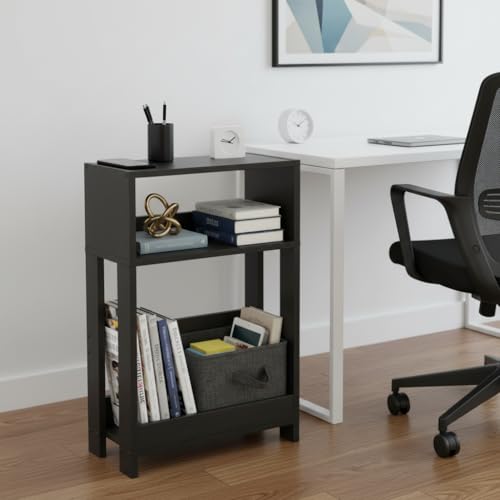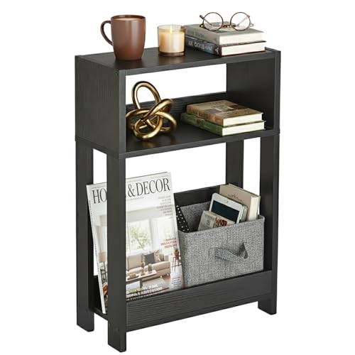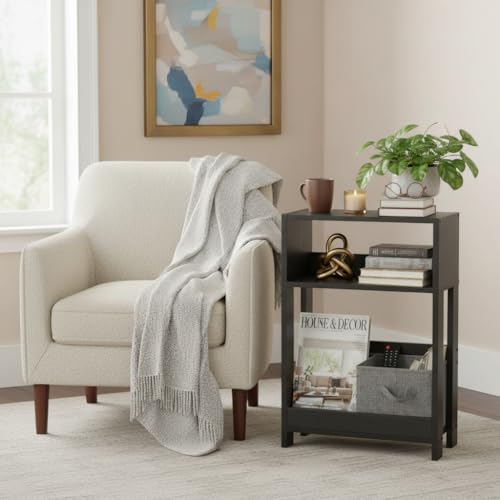 - 3-TIER ORGANIZER FOR MODERN LIVING | This slim table offers tiered convenience: Use the top for drinks, the middle for gadgets (remotes, phone), and the bottom for built-in bookshelf storage. Keeps all your essentials organized and within arm's reach without cluttering your narrow space.