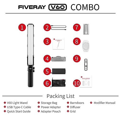 ZHIYUN - Zhiyun FIVERAY V60 Combo 60W LED Light Wand, 2700K~6500K LED Video Light Stick for Photography, Live Streaming, Interviewing, Vlogging- Black