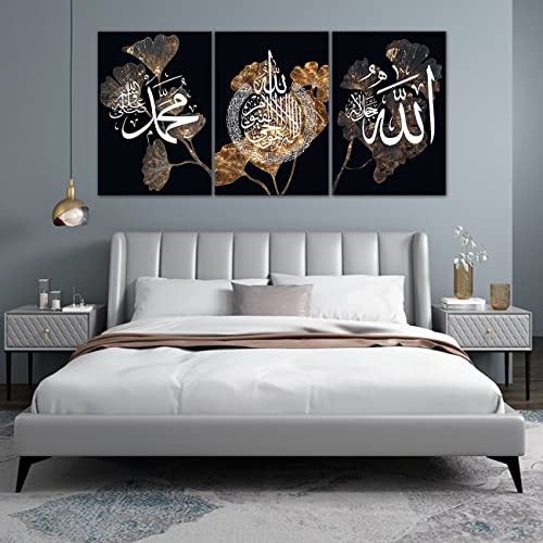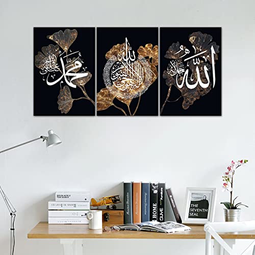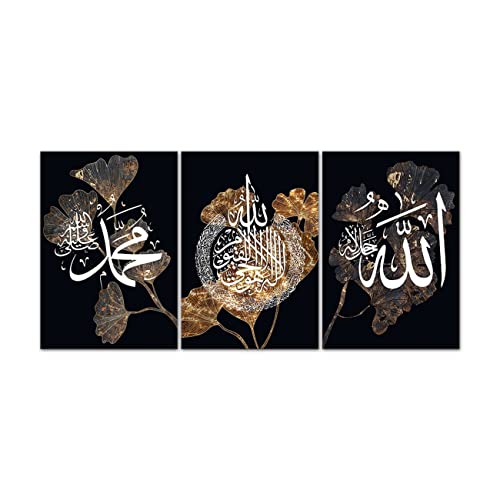 ZHONGYUTONG - ZHONGYUTONG Allah Name Calligraphy Prints Poster Black Gold Leaf Flower White Islamic Wall Art Canvas Poster and Print Paintings Bedroom Home Decor Artwork (12"x16"x3PCS)