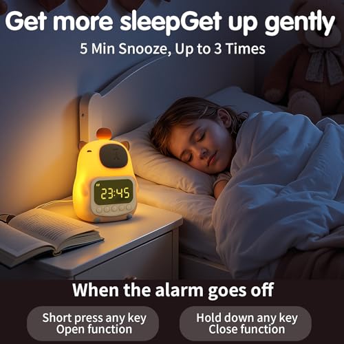 - 【Snooze Function】 - This intuitive clock for kids features a user-friendly snooze function: a light tap delays the alarm by 5 minutes, up to three times, for those extra moments of rest. Made from soft, durable, it’s designed to be gentle on little hands, making it the ultimate clock for kids that ensures long-lasting use in any setting