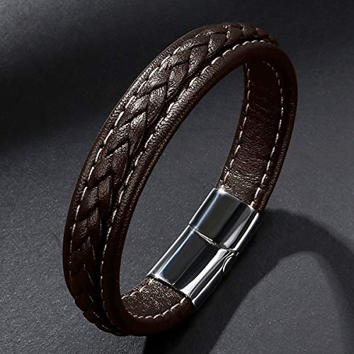 ZiMOJiE - Braided Genuine Leather Bracelet for Mens Bangle Bracelets Fashion Stainless Steel Magnetic Clasp, 8 inches, Leather,